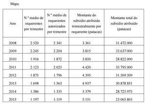As medidas provisórias do subsídio complementar aos rendimentos do trabalho que são aprovadas pelo Regulamento Administrativo n.º 6/2008 “Medidas provisórias do subsídio complementar aos rendimentos do trabalho” e que incidem sobre os trabalhadores por conta de outrem, com baixos rendimentos, foram efectivamente lançadas em 2008, cujo prazo de aplicação tem sido anualmente prolongado por mais um ano através de regulamento administrativo. Até agora, foram essas medidas sucessivamente aplicadas durante 8 anos.
