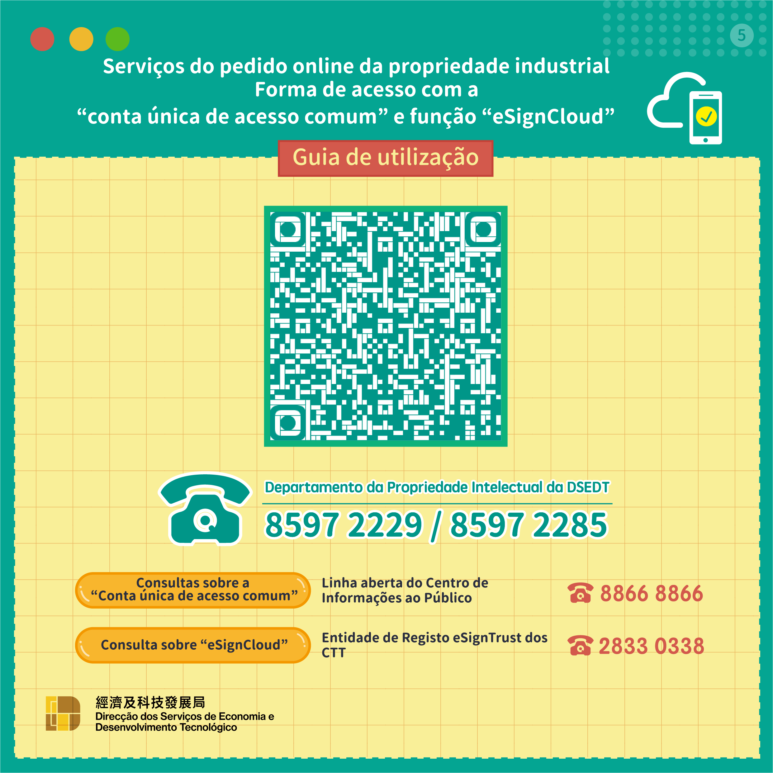 Para mais informações sobre os referidos serviços, é favor consultar o guia de utilização disponível na página electrónica da DSEDT ( https://www.dsedt.gov.mo/pt_PT/web/public/pg_ip_os?_refresh=true ) ou contactar o Departamento da Propriedade Intelectual da DSEDT durante o horário de expediente através dos telefones 85972229 ou 85972285.