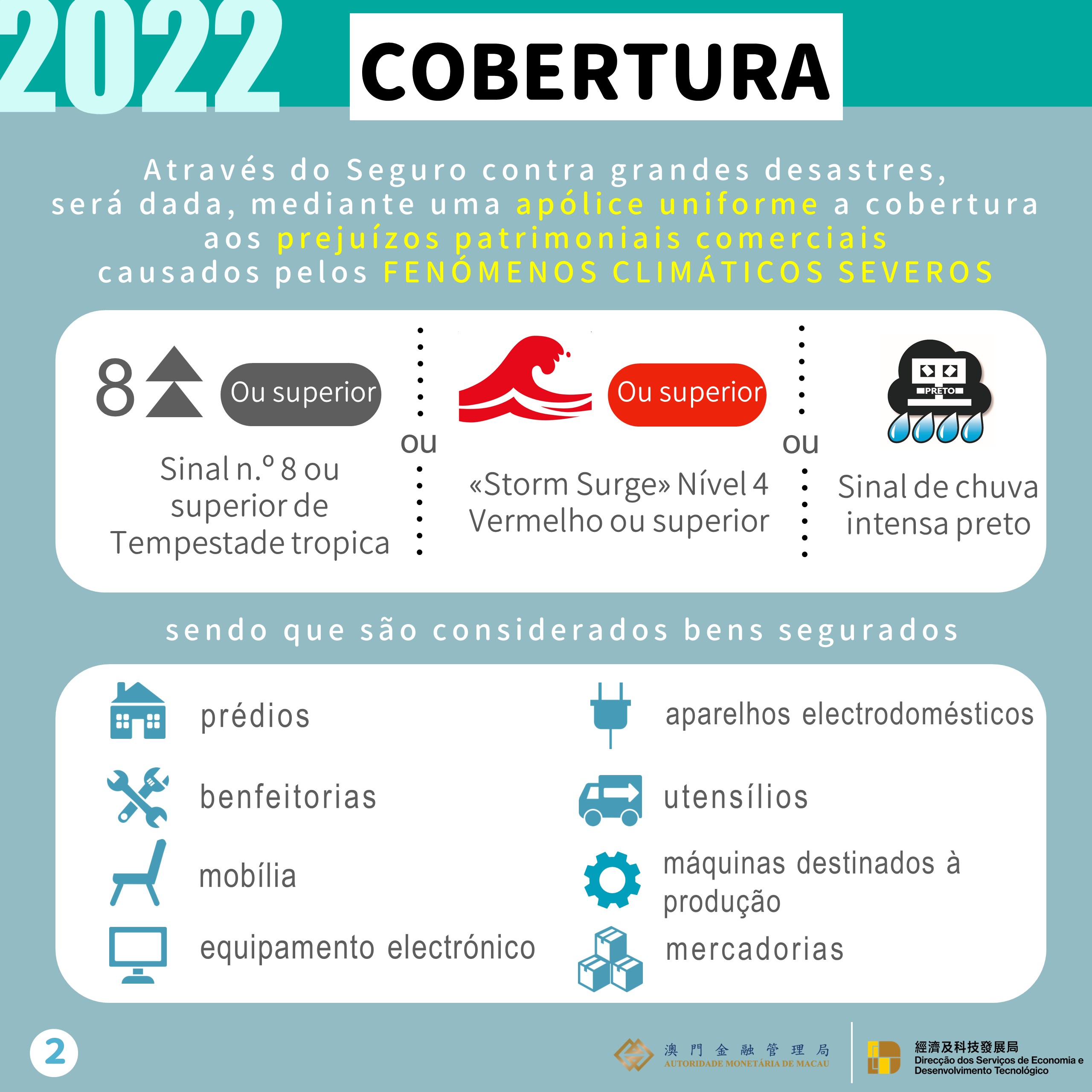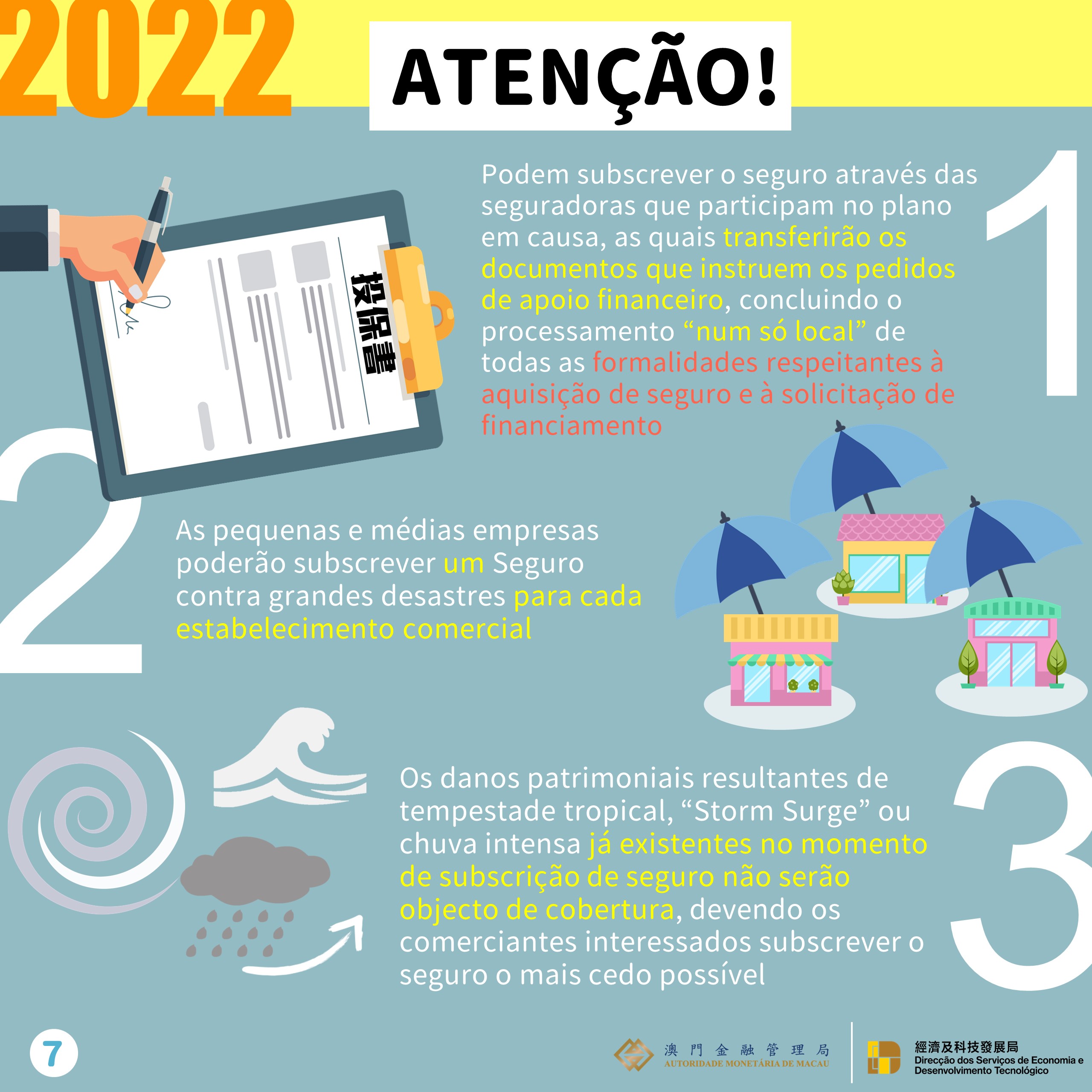 Serão aceites a partir de hoje (dia 13) e até 30 de Dezembro do ano corrente, a subscrição do “Seguro de bens patrimoniais contra grandes desastres para as pequenas e médias empresas” (adiante designado por “Seguro contra grandes desastres”) e a apresentação do pedido do “Plano de apoio financeiro a conceder no âmbito do Seguro de bens patrimoniais contra grandes desastres para as pequenas e médias empresas” (adiante designado por “Apoio financeiro de prémio do seguro contra grandes desastres”) para o ano de 2022. Informa-se que a cobertura deste seguro é alargada, neste ano, aos prejuízos verificados quando o sinal de chuva intensa preto é emitido, esperando-se que esta solução possa satisfazer melhor as necessidades das pequenas e médias empresas.