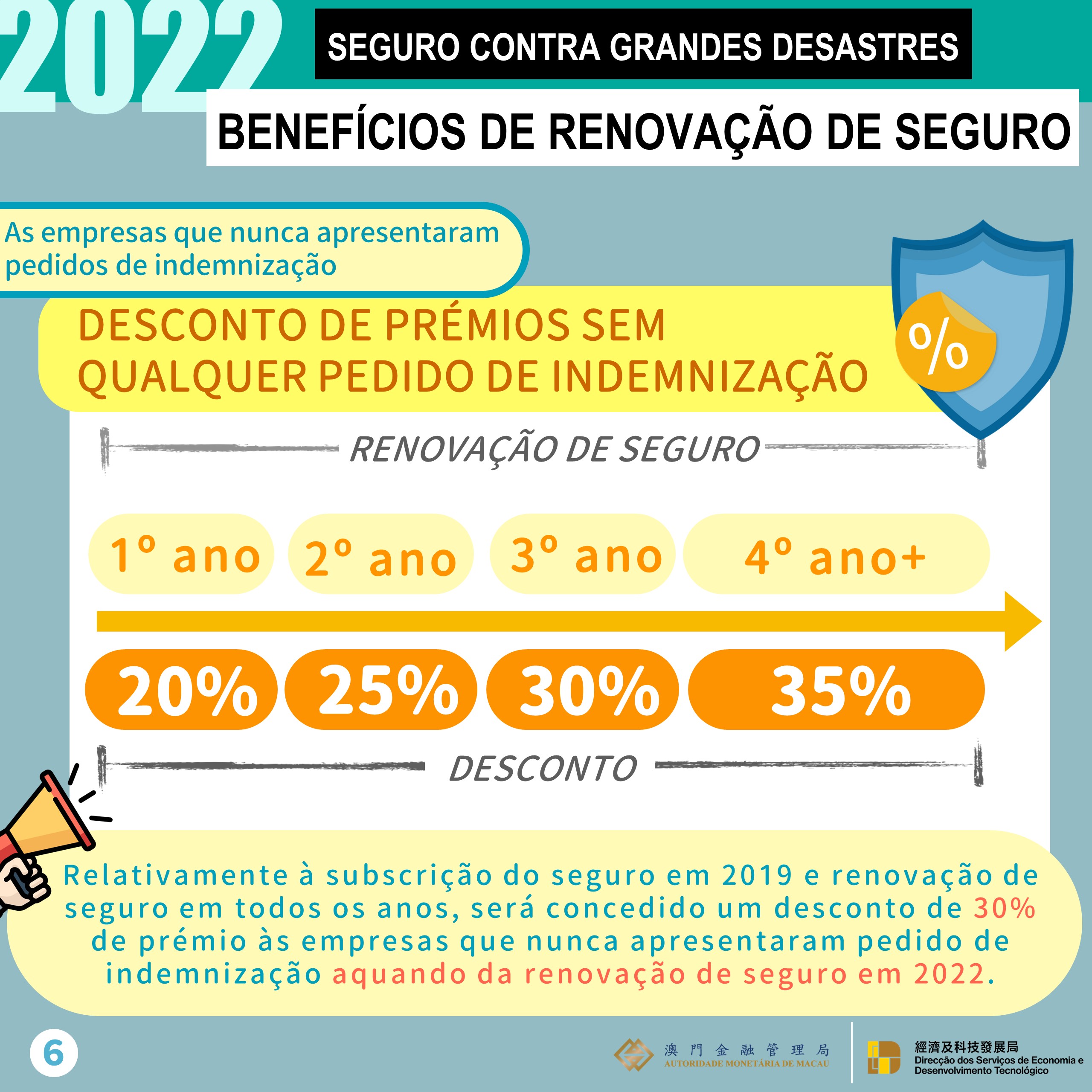 As pequenas e médias empresas podem subscrever um “Seguro contra grandes desastres” para cada estabelecimento comercial, através das cinco seguradoras de Macau que participam no plano supramencionado. Os valores seguros são de 100.000, 200.000 ou 300.000 patacas, respectivamente, enquanto que os prémios correspondentes são de 25.000, 50.000 ou 75.000 patacas. Além disso, será concedido um desconto nos prémios às empresas que nunca apresentaram pedidos de indemnização, aquando da renovação do seguro, sendo os descontos 20%, 25%, 30% para o primeiro, segundo e terceiro anos de renovação de seguro, respectivamente. Em relação às renovações a efectuar no quarto ano ou nos anos seguintes, serão concedidos descontos de 35%. Espera-se que as medidas mencionadas possam estimular as empresas a continuarem a subscrever o seguro, com a finalidade de gestão dos seus riscos próprios.