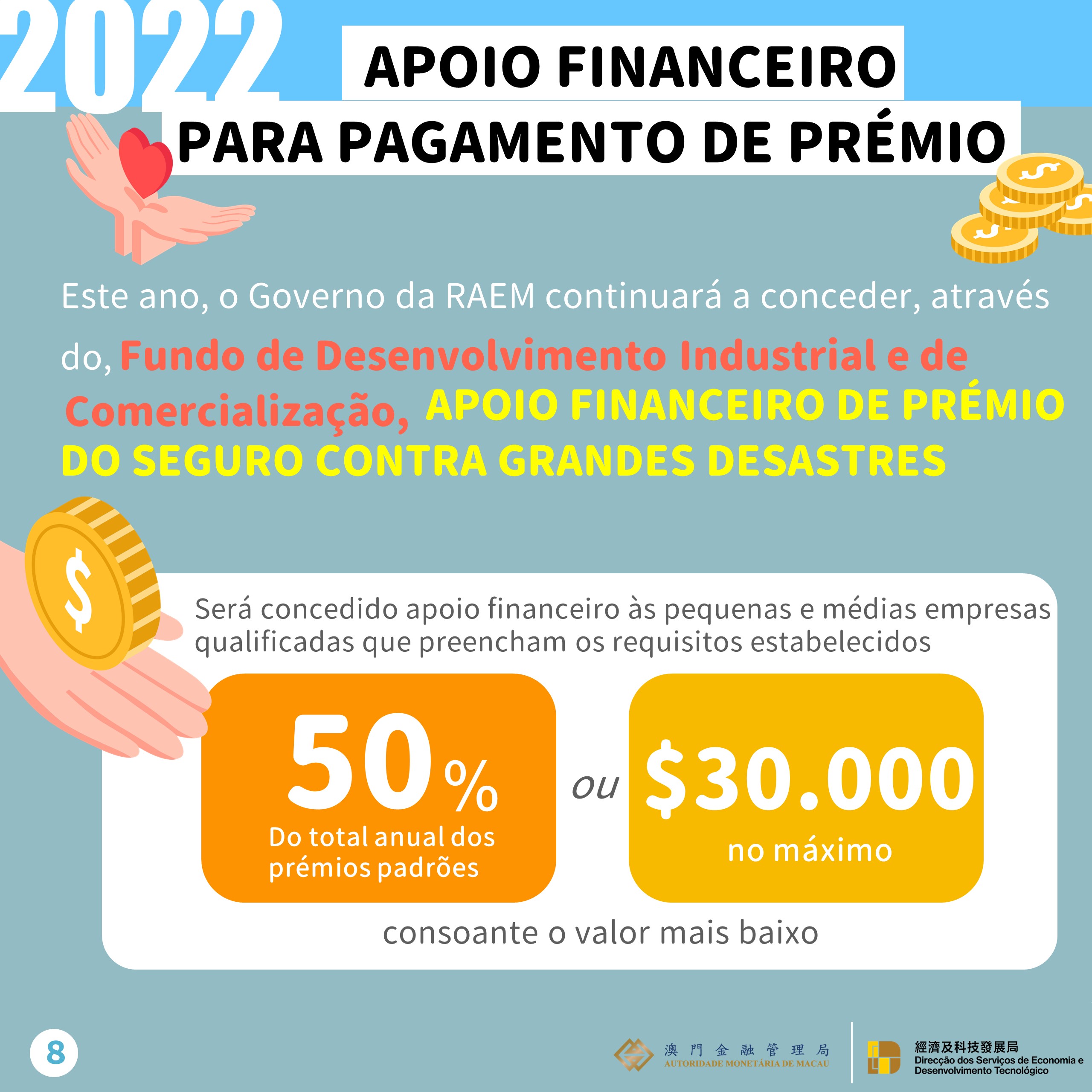 Além disso, o Governo da RAEM continuará a conceder, através do Fundo de Desenvolvimento Industrial e de Comercialização, o “Apoio financeiro de prémio do seguro contra grandes desastres” às pequenas e médias empresas qualificadas, que preencham os requisitos estabelecidos, sendo que o valor do apoio financeiro equivale a 50% ou, no máximo, a 30.000 patacas do total anual do prémio padrão (consoante o valor mais baixo), e tem como objetivo aumentar o interesse das pequenas e médias empresas na aquisição do “Seguro contra grandes desastres” e reduzir os encargos financeiros das mesmas. Para o efeito, as seguradoras podem ajudar a receber e transferir os documentos que instruem os pedidos de apoio financeiro, de modo a facilitar o respectivo processamento “num só local”, de todas as formalidades respeitantes à aquisição de “Seguro contra grandes desastres” e à solicitação de financiamento, por parte das empresas interessadas. Face à premência e às dificuldades com que os comerciantes se confrontam, após grandes desastres, as seguradoras continuarão a acelerar os procedimentos com vista ao pagamento rápido das indemnizações.