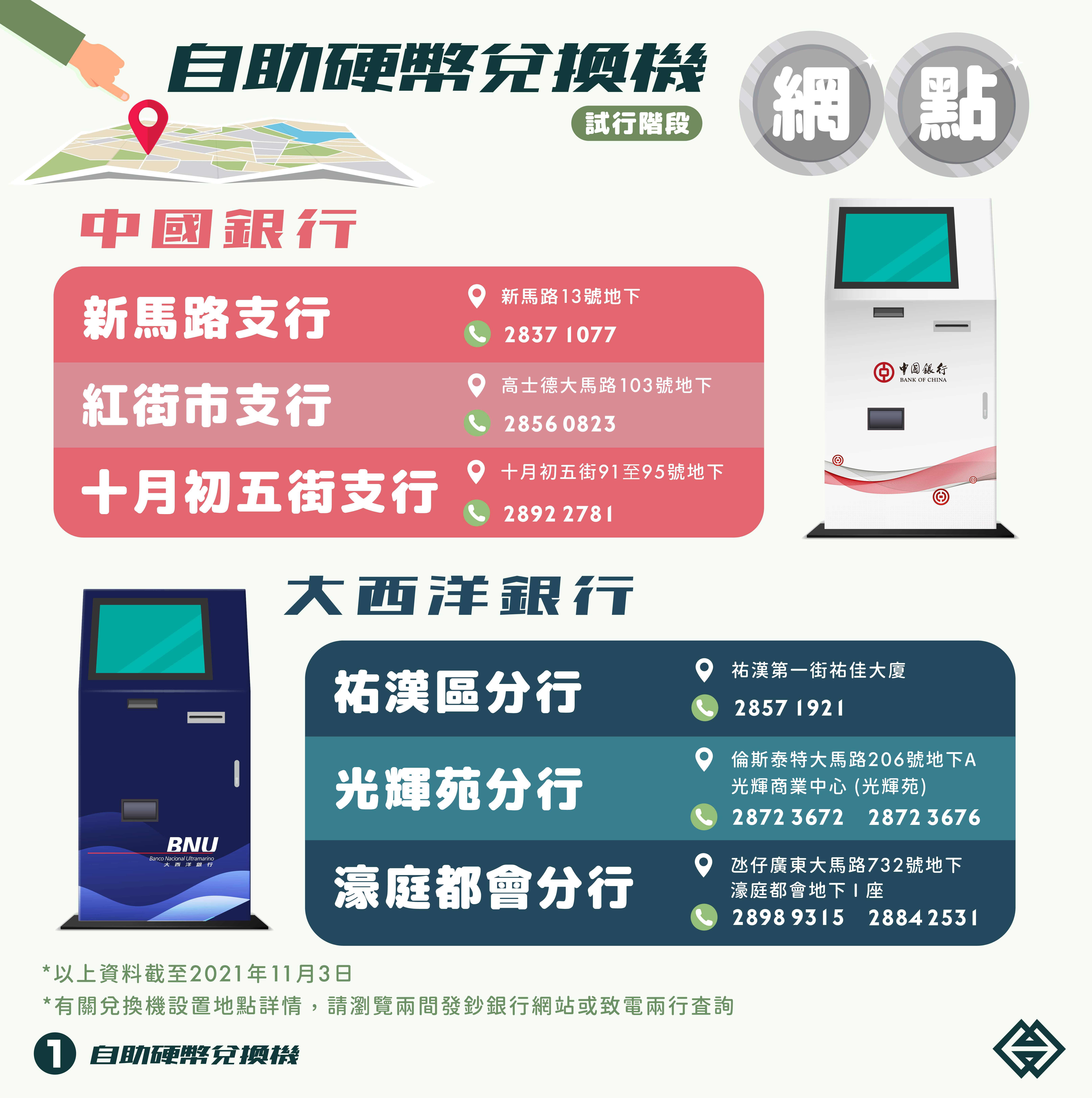 为进一步便利公众兑换流通硬币,促进硬币流通,澳门金融管理局协调两间发钞银行( 中国银行及大西洋银行 ),在现时提供的“免费辅币兑换服务”的基础上,今( 3 )日于指定网点试行推出“自助硬币兑换机”。