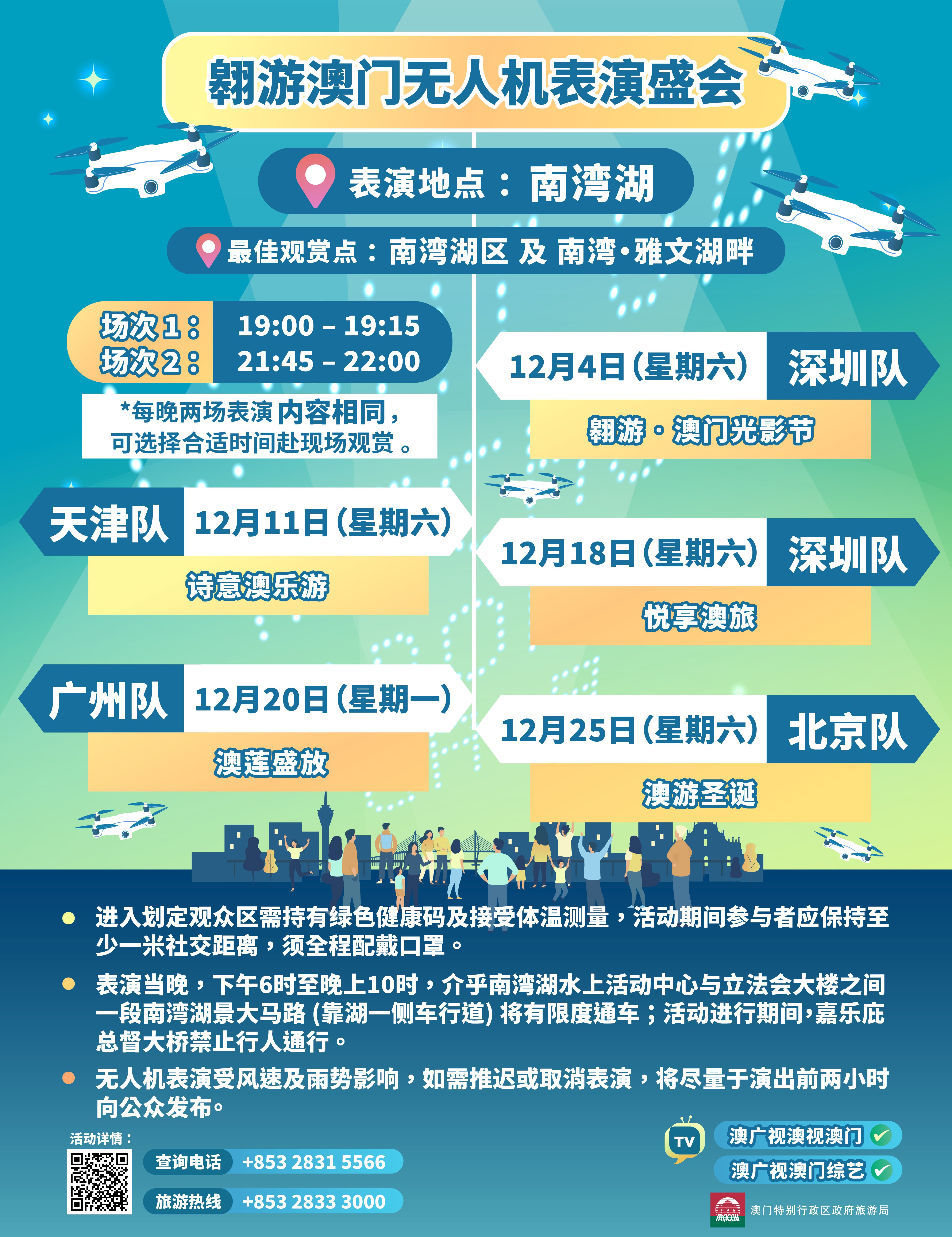 旅游局首办的“翱游澳门无人机表演盛会”于(明)12月11日晚上7时及9时45分在南湾湖畔上演第二场演出;色彩斑斓的无人机演出丰富旅客及居民夜间娱乐,促进夜间经济发展。