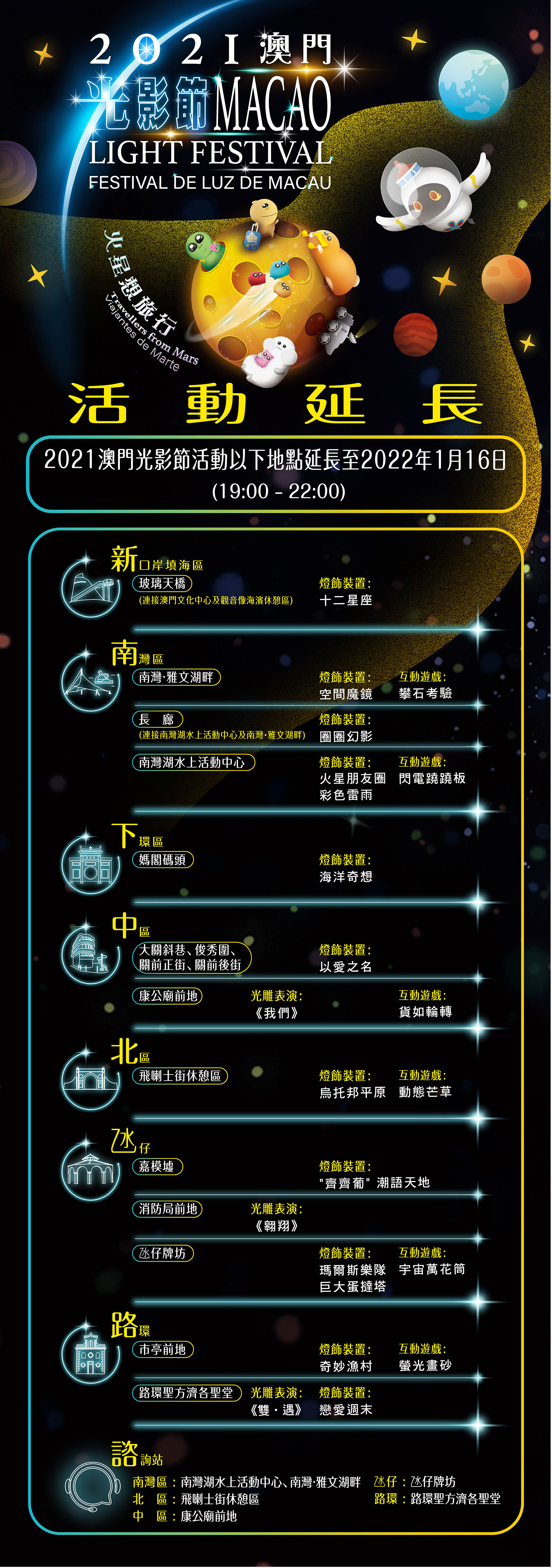 原定于2022年1月2日结束的“2021澳门光影节 ─ 火星想旅行”,开展至今广受欢迎,为了让更多居民和旅客入区参与及消费,延续盛事效应,旅游局决定延长澳门光影节大部份活动及装置至2022年1月16日。