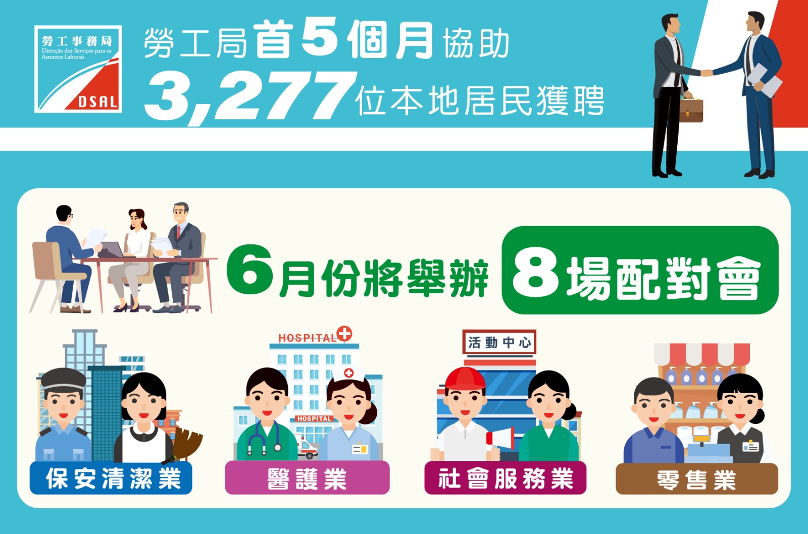 面对澳门就业环境变化,劳工局一直尽最大努力,协助求职居民就业转业,透过推出各项就业支援措施,首5个月已协助3,277人就业。