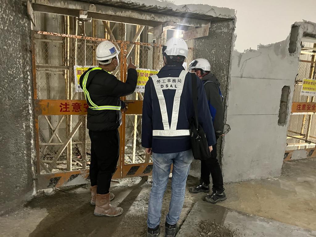 劳工局人员对64个建筑工地及工程地点进行劳动及职安健巡查,提醒工地承造商、负责人、安全管理人员及工友们做好假期前后的安全维护和设施检查工作,例如:一些针对高空工作时预防人体下坠的设施检查(如:围栏、踢脚板、工作平台)、外墙棚架的稳固性、以及电力设备、起重机械及装置是否处于安全状况等。