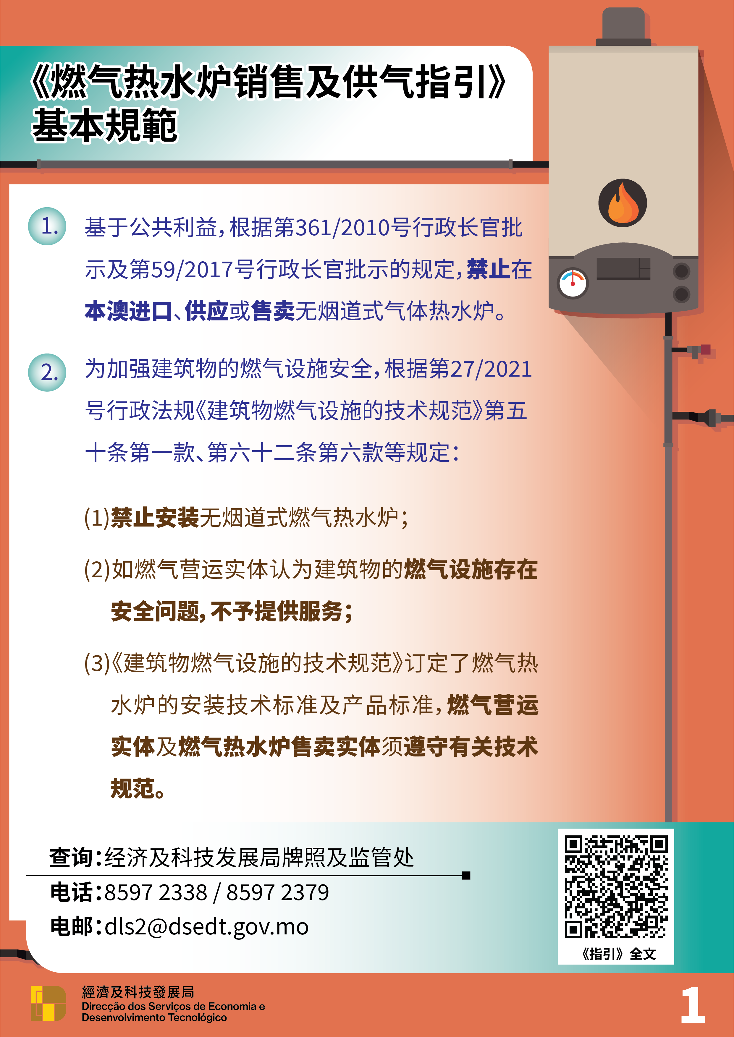 《指引》重申燃气热水炉的相关法律规定,包括禁止在本澳进口、供应、售卖或安装无烟道式气体热水炉;燃气热水炉的安装技术标准、产品标准及相关技术规范需符合第27/2021号行政法规《建筑物燃气设施的技术规范》的规定。