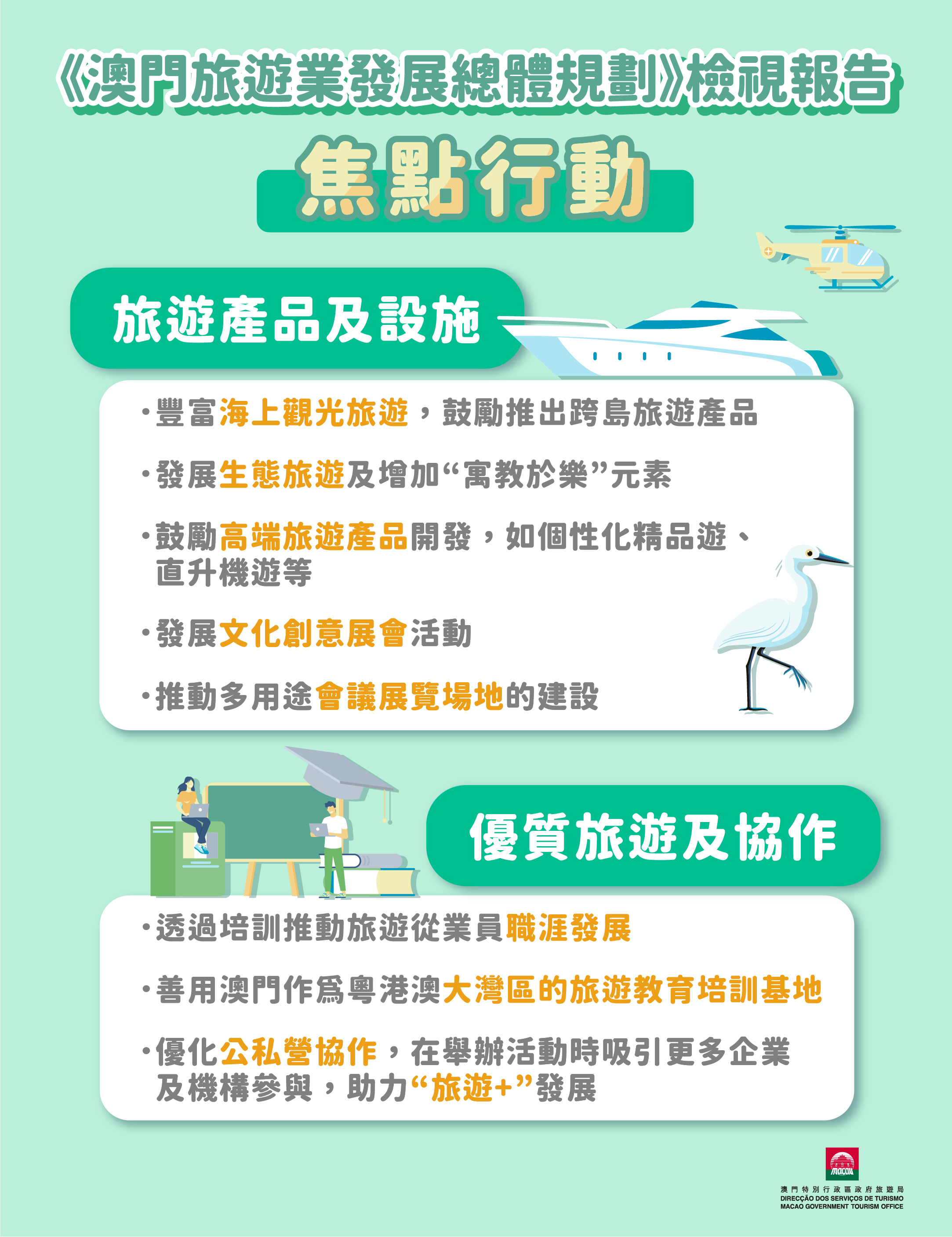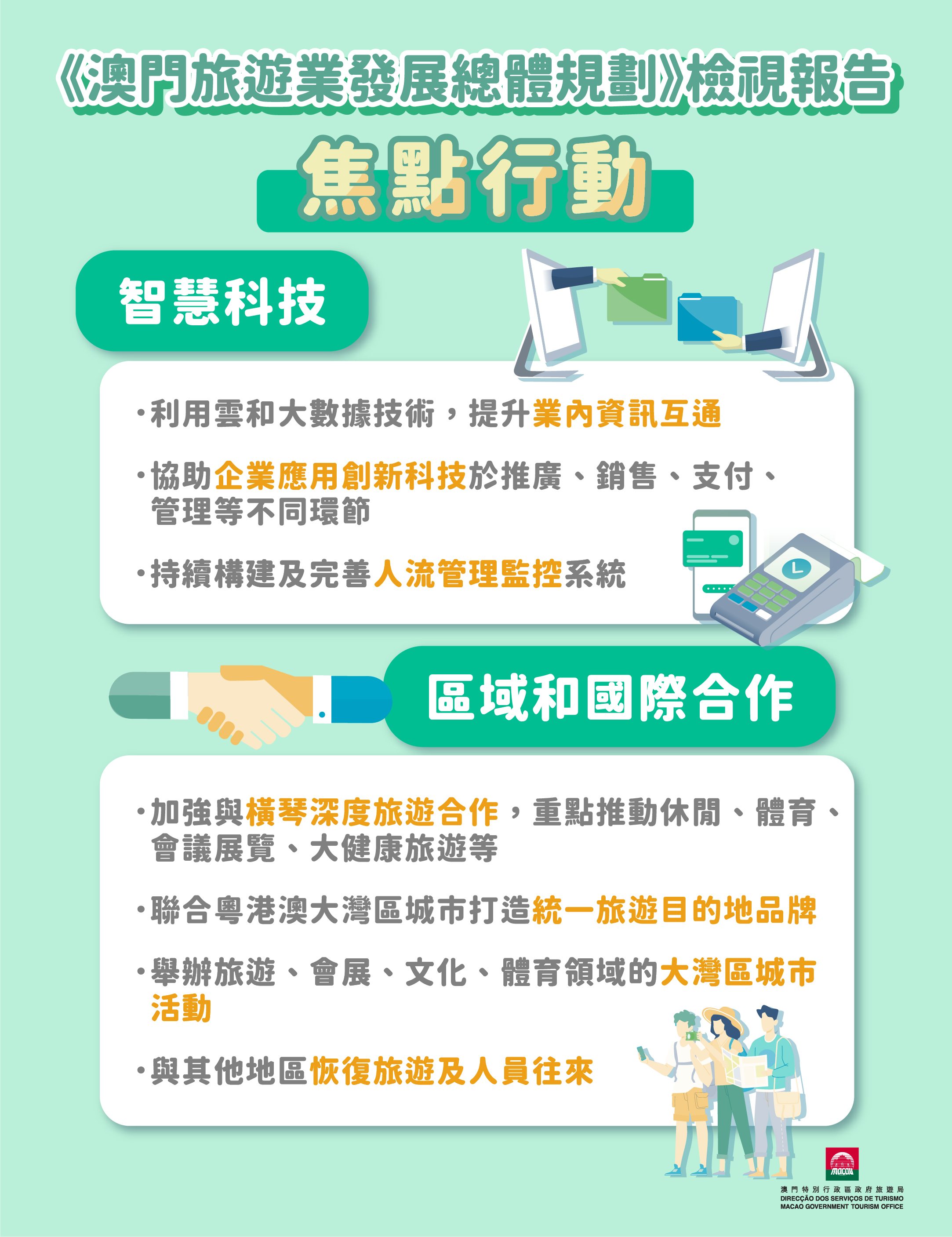 焦點行動包括海上觀光遊項目、生態遊及高端旅遊產品;培訓課程、大灣區培訓基地促進優質旅遊、優化公私營協作、助力 “旅遊+”發展;加強與電商及網媒合作、利用大數據分析對高價值旅客精準營銷;拓展新景點、增強海陸空交通聯繫;加強利用創新科技提升旅客體驗及營商環境;加強與橫琴及大灣區城市深度旅遊合作以及爭取與其他地區恢復旅遊和人員往來等。