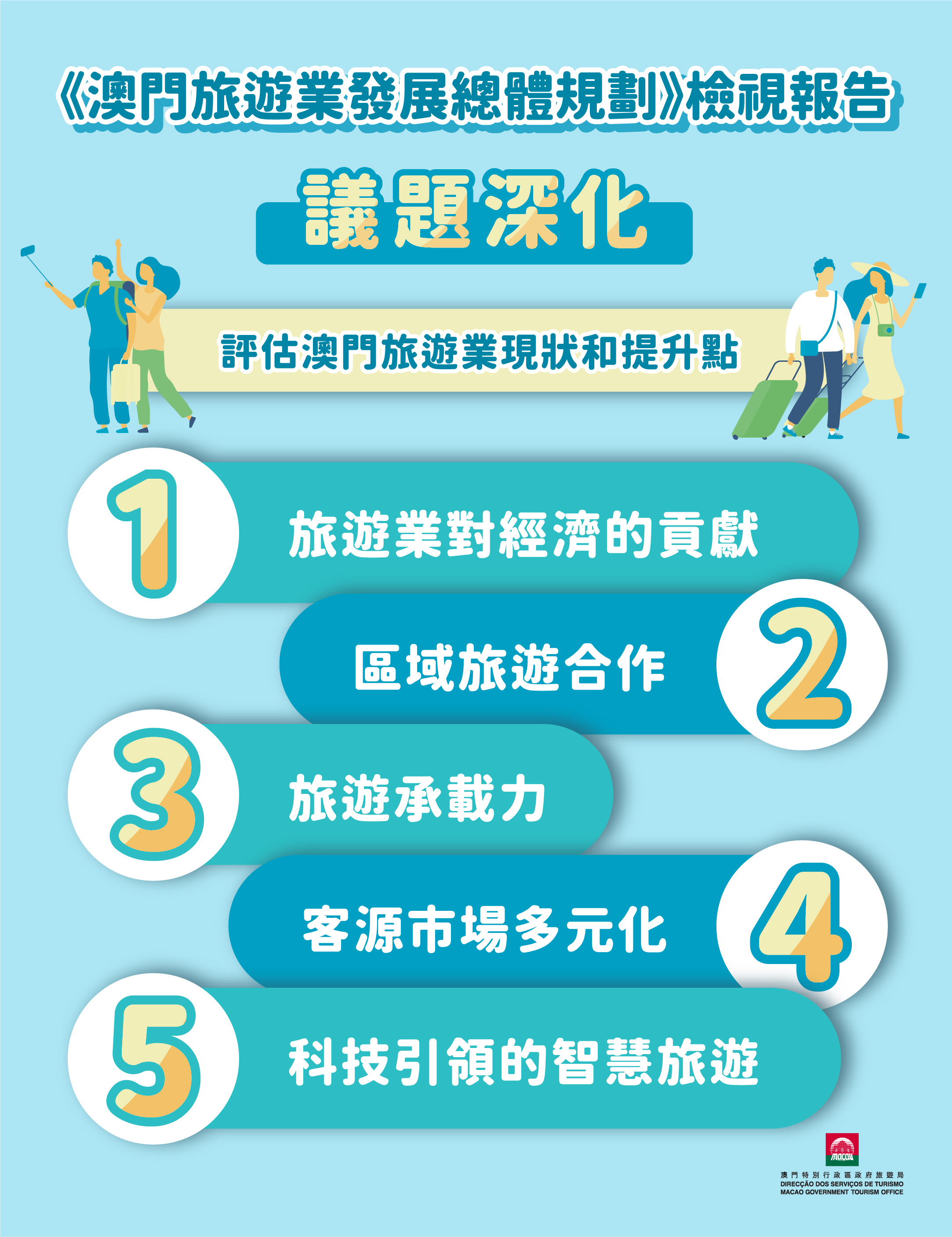 《總體規劃》的首份檢視研究結果於今(12日)公佈,未來將透過豐富旅遊產品及設施、推動優質旅遊、優化精準營銷、完善城市建設、善用智慧科技、拓展區域和國際合作等6個範疇進一步積極開展相關工作。