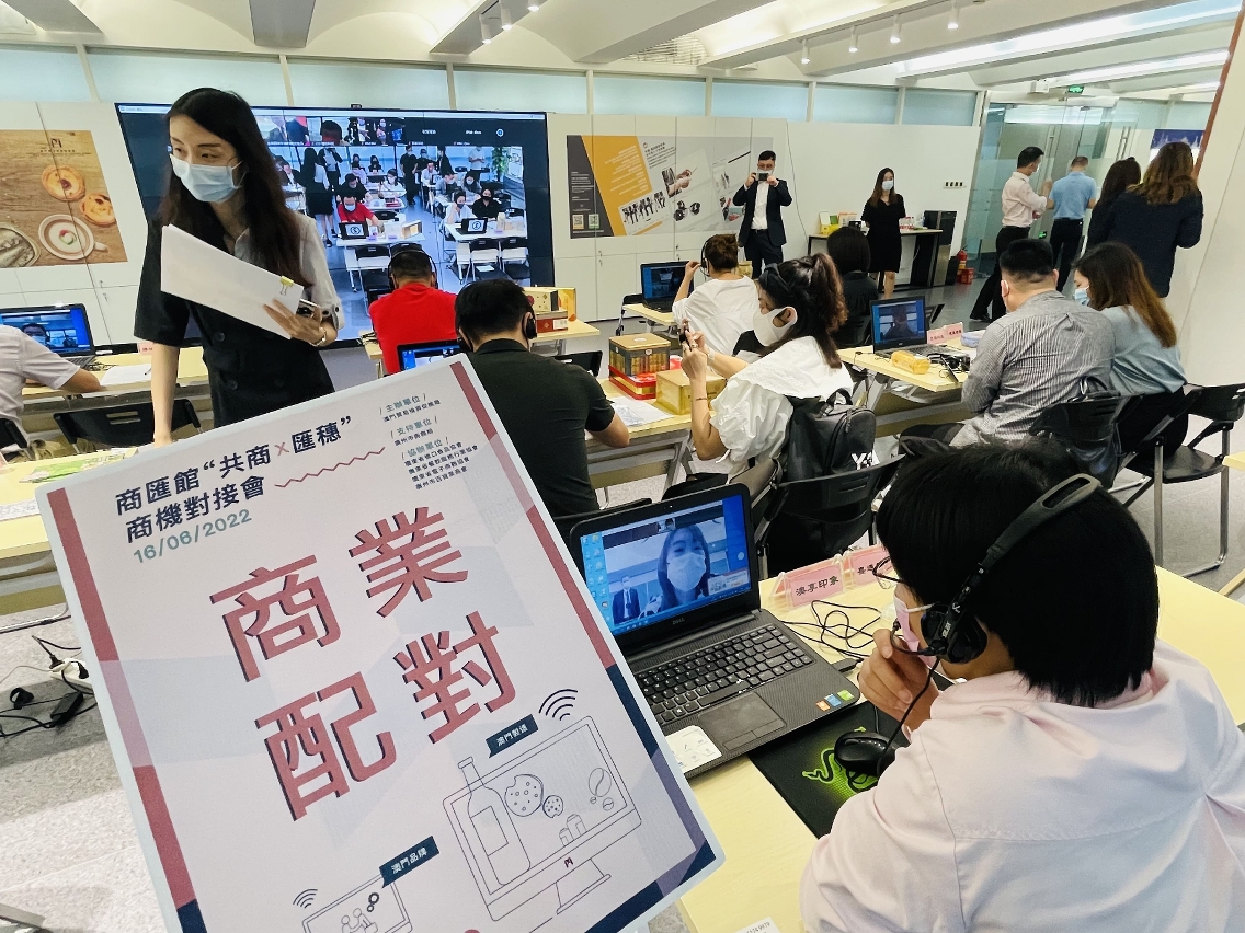商匯館“‘共商x匯穗’商機對接會”於6月16日線上線下雙線舉行,在澳門和廣州設置會場,聯動商匯館展商與內地客商線上交流覓合作商機,共吸引約50位穗澳企業代表參與,期間共進行逾40場商業配對洽談,涉及貿易、餐飲、文創、食品加工、零售批發、電子商務等範疇。