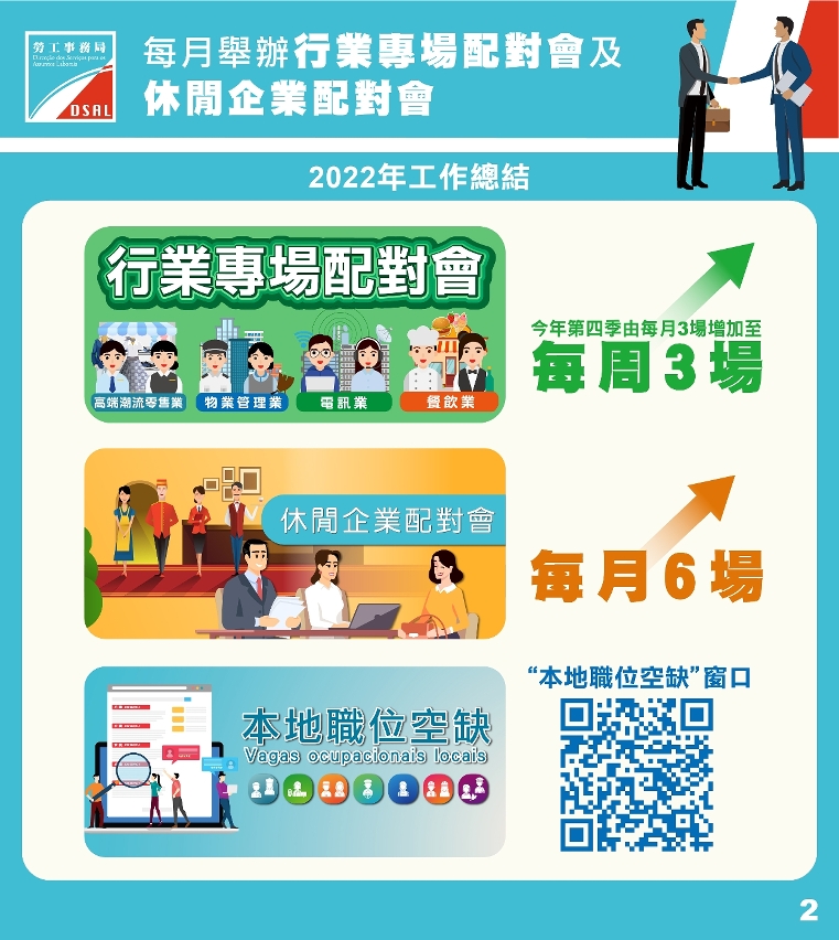自2020年第4季起,勞工局在原有恆常配對基礎上,每月舉辦3場行業專場配對會,加大就業配對力度。2022年,因應就業環境變化,逐步增加場次至每周3場,並推出每月6場的休閒企業配對會,為居民提供不同行業職種的空缺。