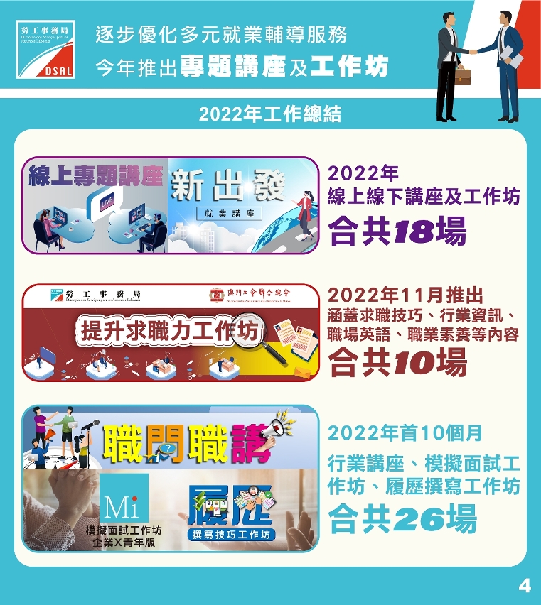 為增加求職者獲聘機會,2022年起,勞工局加強與企業及社團合作,推出線上線下講座及工作坊,邀請業界資深代表和相關專業人士,為求職者提供就業市場最新資訊和指導求職技巧。2022年首10個月,分別與不同休閒企業合辦 “新出發” 就業講座,又與高端潮流零售業界代表合辦線上線下講座及工作坊,合共18場。